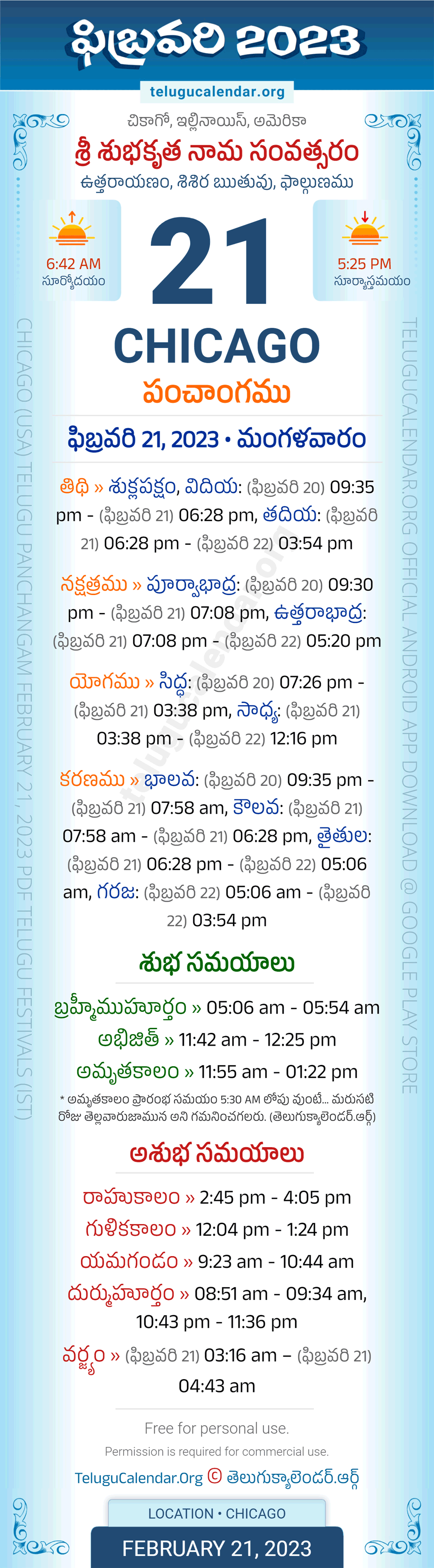 Download » February 21, 2023 » Chicago (USA) Telugu Panchangam Daily Sheet with Auspicious and Inauspicious Timings.