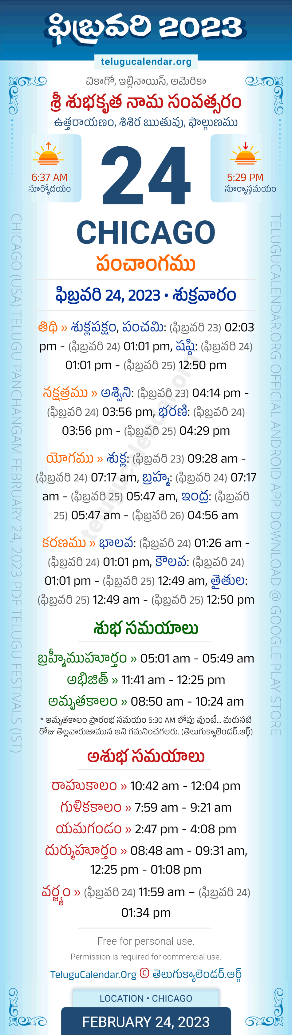 Download » February 24, 2023 » Chicago (USA) Telugu Panchangam Daily Sheet with Auspicious and Inauspicious Timings.