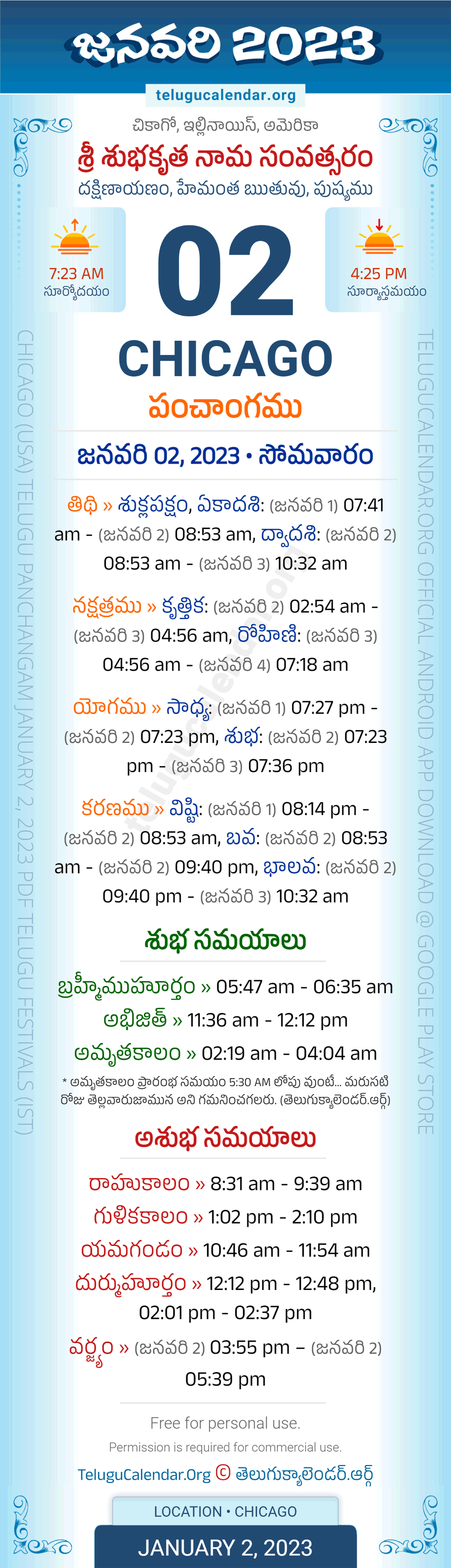 Download » January 2, 2023 » Chicago (USA) Telugu Panchangam Daily Sheet with Auspicious and Inauspicious Timings.