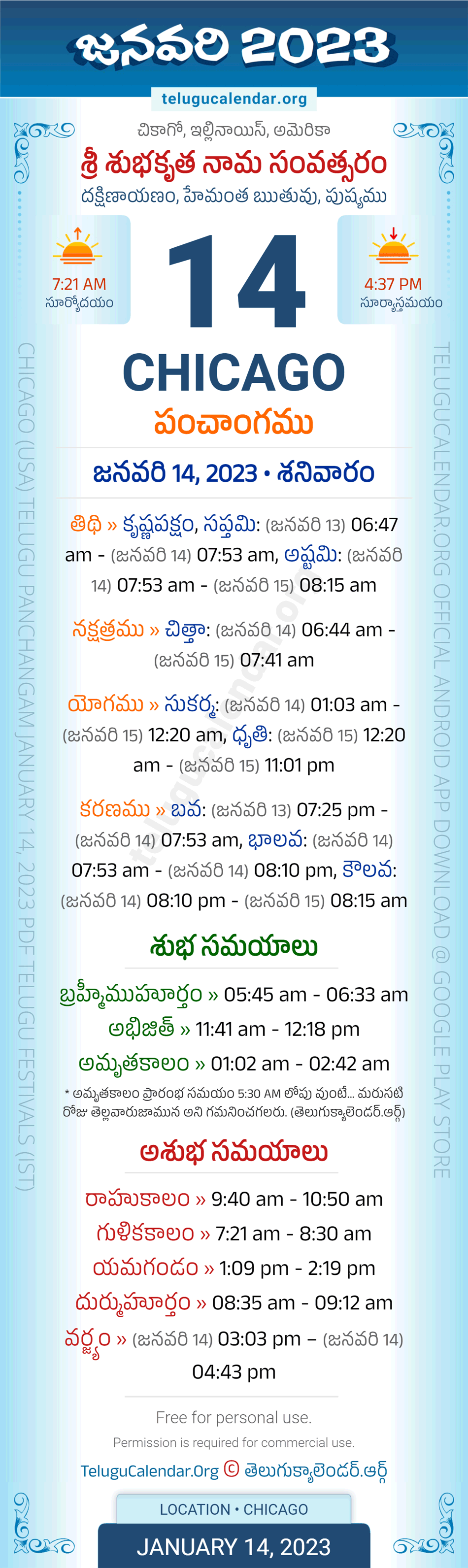 Download » January 14, 2023 » Chicago (USA) Telugu Panchangam Daily Sheet with Auspicious and Inauspicious Timings.