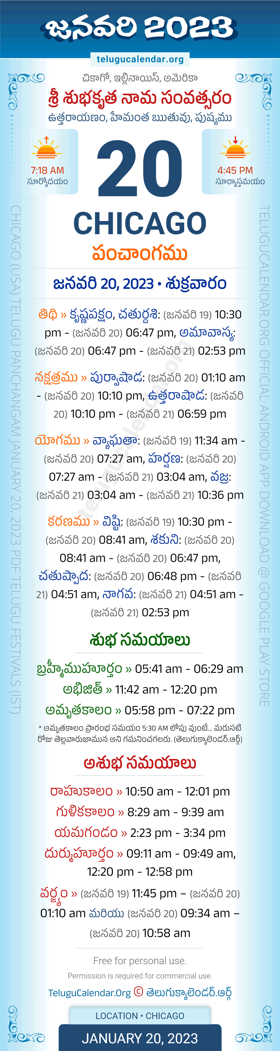 Download » January 20, 2023 » Chicago (USA) Telugu Panchangam Daily Sheet with Auspicious and Inauspicious Timings.