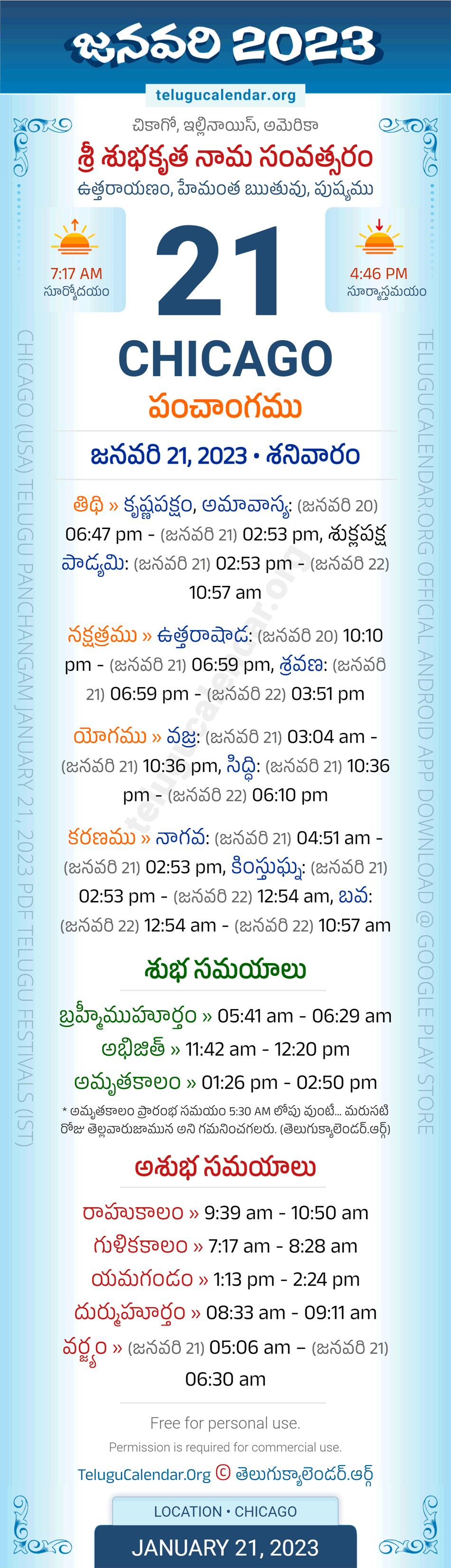 Download » January 21, 2023 » Chicago (USA) Telugu Panchangam Daily Sheet with Auspicious and Inauspicious Timings.