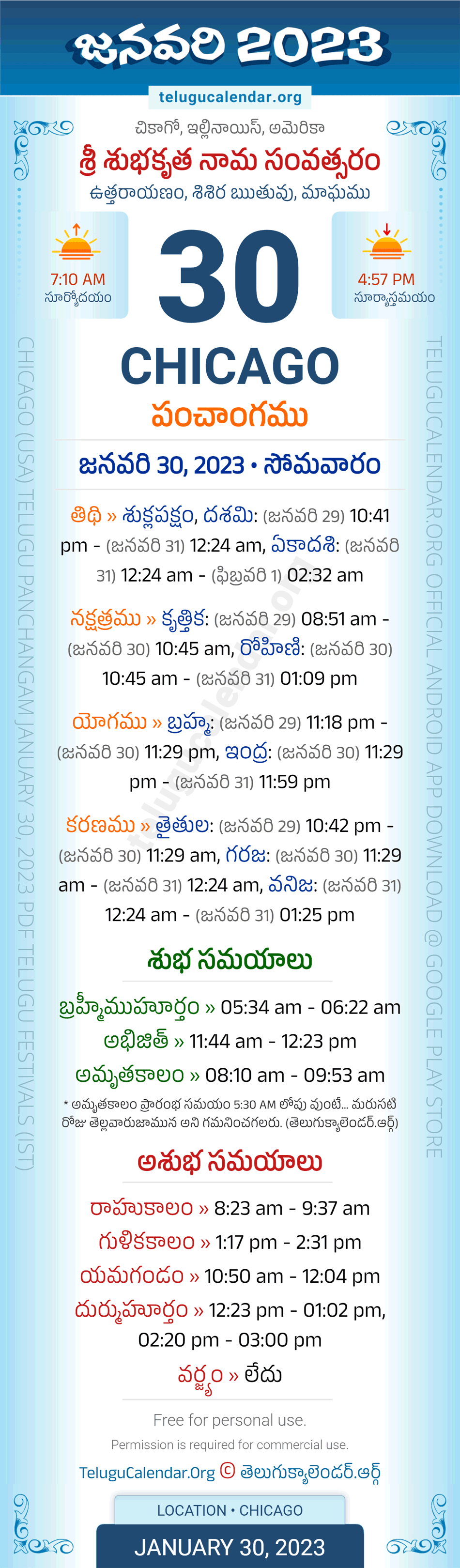 Download » January 30, 2023 » Chicago (USA) Telugu Panchangam Daily Sheet with Auspicious and Inauspicious Timings.