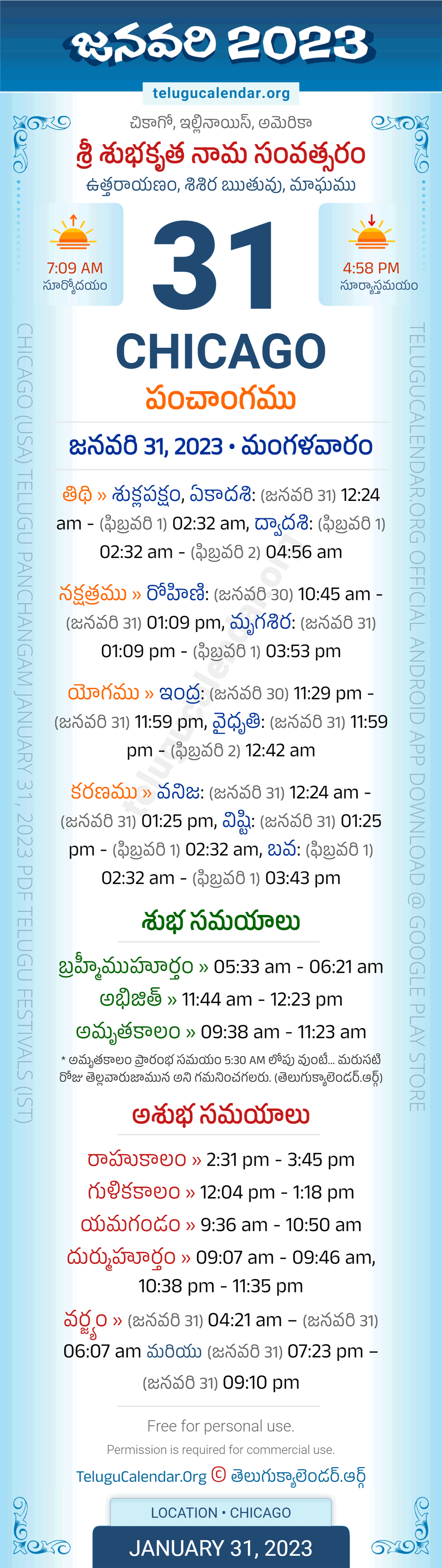Download » January 31, 2023 » Chicago (USA) Telugu Panchangam Daily Sheet with Auspicious and Inauspicious Timings.