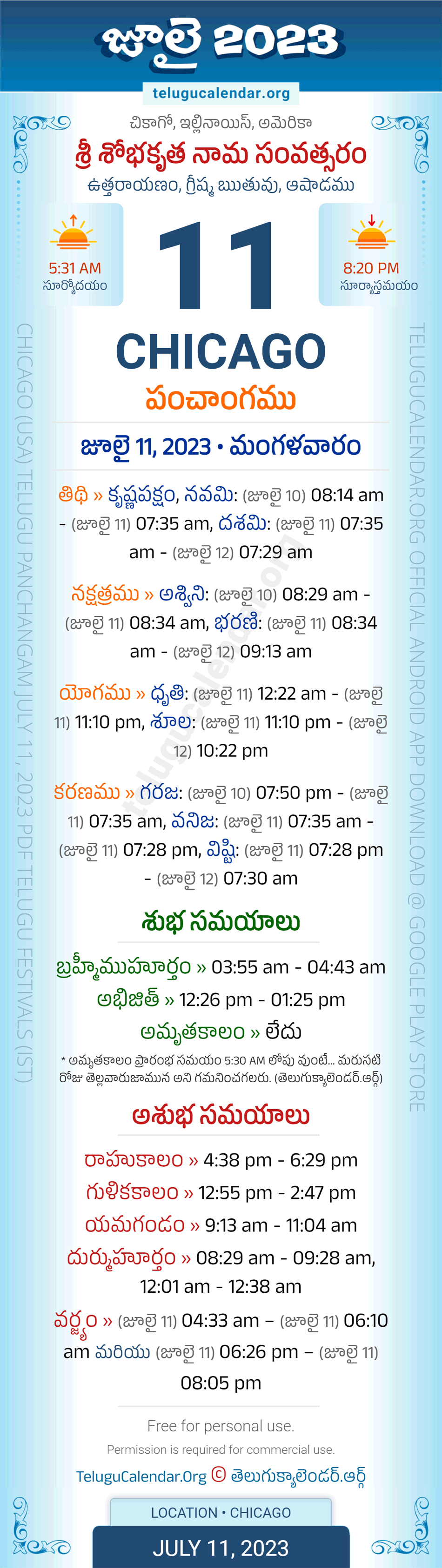 Download » July 11, 2023 » Chicago (USA) Telugu Panchangam Daily Sheet with Auspicious and Inauspicious Timings.