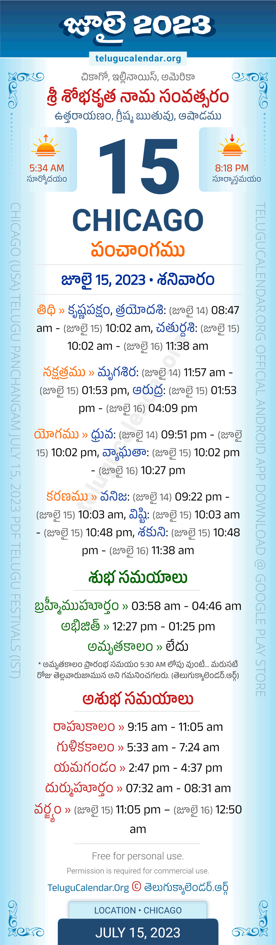 Download » July 15, 2023 » Chicago (USA) Telugu Panchangam Daily Sheet with Auspicious and Inauspicious Timings.