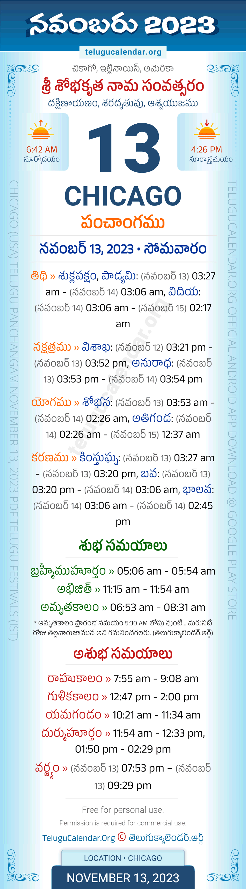 Chicago Panchangam November 13, 2023 Daily Sheet in Telugu... Chicago Telugu Panchangam Monday, November 13, 2023, Today's Chicago Tithi: Sukla Paksham, Padyami: (Nov 13) 03:27 am - (Nov 14) 03:06 am, Vidiya: (Nov 14) 03:06 am - (Nov 15) 02:17 am, Today's Chicago Nakshatram: Visakha: (Nov 12) 03:21 pm - (Nov 13) 03:52 pm, Anuradha: (Nov 13) 03:53 pm - (Nov 14) 03:54 pm, Telugu Year: Sri Sobhakritu Nama Samvatsaram, Vedic Aayana: Dakshinayanam, Vedic Rutuvu: Sharad, Chandramasa (Amanta): Ashwayujamu. Below image showing information about the 5 attributes of the day, viz., Varam, Tithi, Nakshatram, Yogam & Karanam along with starting and end timings. Read more