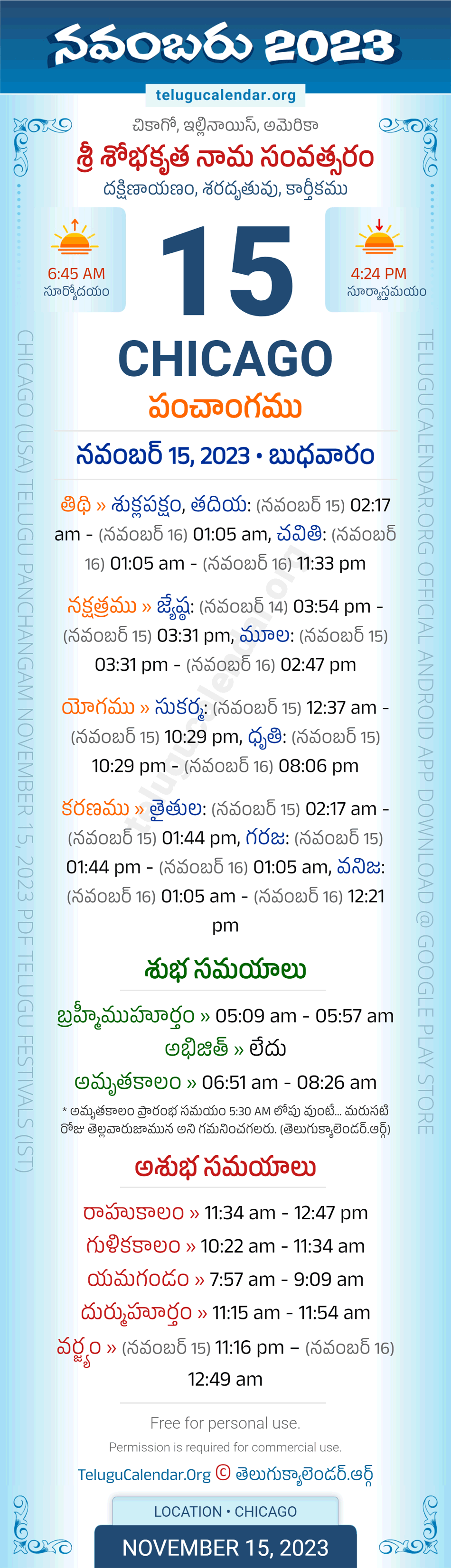 Apart from the Panchangam November 15, 2023 Chicago Telugu Calendar Daily Sheet, you can also find the Sunrise and Sunset (Middle Limb) timings, Paksham, Telugu Year, Yanam, Rutuvu, Telugu Month. Today's Chicago Auspicious Timings November 15, 2023 (Shubha Muhuratam Today Good Timings like Abhijit Muhurtham, Amruta Kalam & Brahma Muhurtham) and Today's Chicago Inauspicious Timings November 15, 2023 (Bad Timings like Durmuhurtham, Rahukalam, Gulika kalam & Yamagandam) with starting and end timings in the above image.