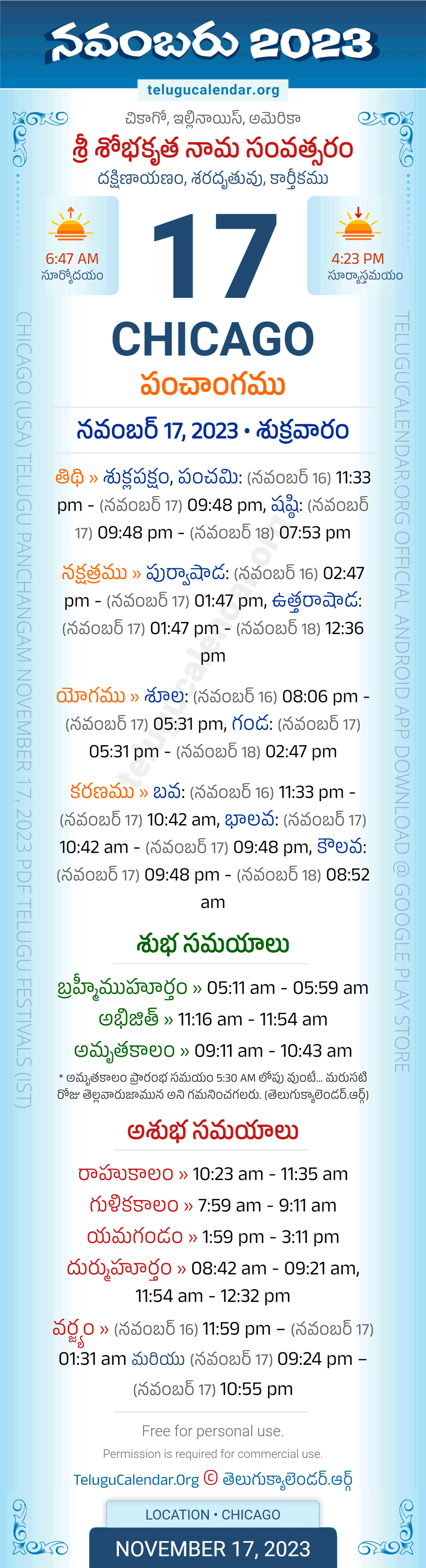 Chicago Panchangam November 17, 2023 Daily Sheet in Telugu... Chicago Telugu Panchangam Friday, November 17, 2023, Today's Chicago Tithi: Sukla Paksham, Panchami: (Nov 16) 11:33 pm - (Nov 17) 09:48 pm, Shashthi: (Nov 17) 09:48 pm - (Nov 18) 07:53 pm, Today's Chicago Nakshatram: Purva Ashadha: (Nov 16) 02:47 pm - (Nov 17) 01:47 pm, Uttara Ashadha: (Nov 17) 01:47 pm - (Nov 18) 12:36 pm, Telugu Year: Sri Sobhakritu Nama Samvatsaram, Vedic Aayana: Dakshinayanam, Vedic Rutuvu: Sharad, Chandramasa (Amanta): Kartikamu. Below image showing information about the 5 attributes of the day, viz., Varam, Tithi, Nakshatram, Yogam & Karanam along with starting and end timings. Read more