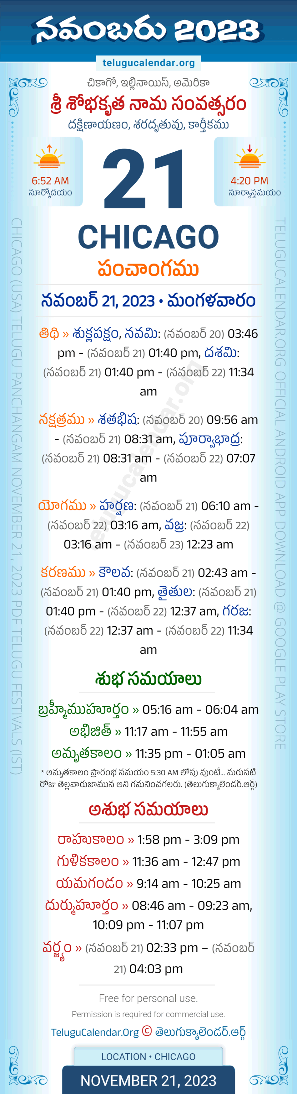 Apart from the Panchangam November 21, 2023 Chicago Telugu Calendar Daily Sheet, you can also find the Sunrise and Sunset (Middle Limb) timings, Paksham, Telugu Year, Yanam, Rutuvu, Telugu Month. Today's Chicago Auspicious Timings November 21, 2023 (Shubha Muhuratam Today Good Timings like Abhijit Muhurtham, Amruta Kalam & Brahma Muhurtham) and Today's Chicago Inauspicious Timings November 21, 2023 (Bad Timings like Durmuhurtham, Rahukalam, Gulika kalam & Yamagandam) with starting and end timings in the above image.