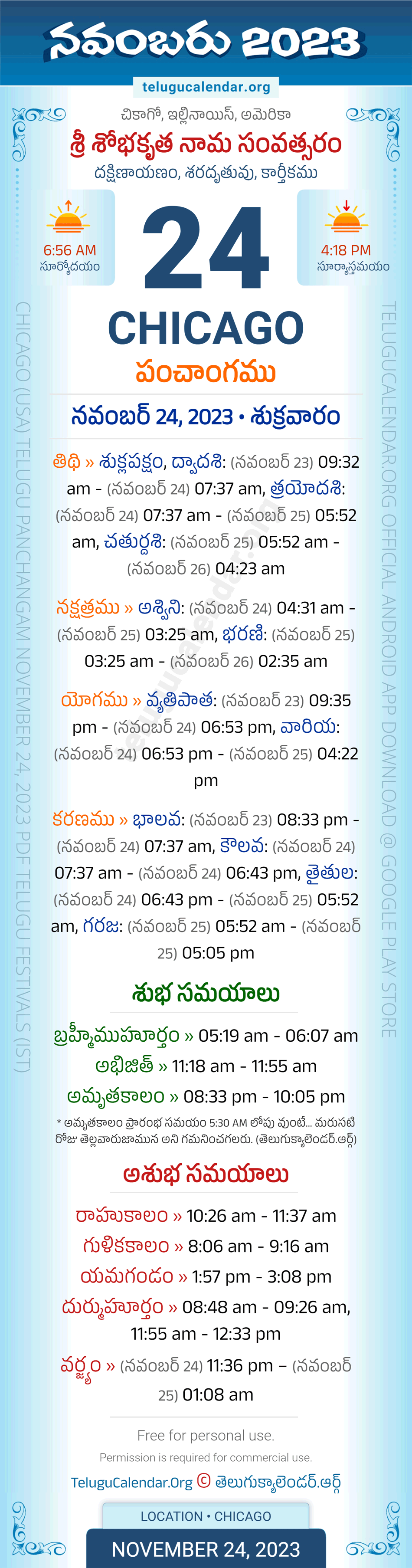 Apart from the Panchangam November 24, 2023 Chicago Telugu Calendar Daily Sheet, you can also find the Sunrise and Sunset (Middle Limb) timings, Paksham, Telugu Year, Yanam, Rutuvu, Telugu Month. Today's Chicago Auspicious Timings November 24, 2023 (Shubha Muhuratam Today Good Timings like Abhijit Muhurtham, Amruta Kalam & Brahma Muhurtham) and Today's Chicago Inauspicious Timings November 24, 2023 (Bad Timings like Durmuhurtham, Rahukalam, Gulika kalam & Yamagandam) with starting and end timings in the above image.