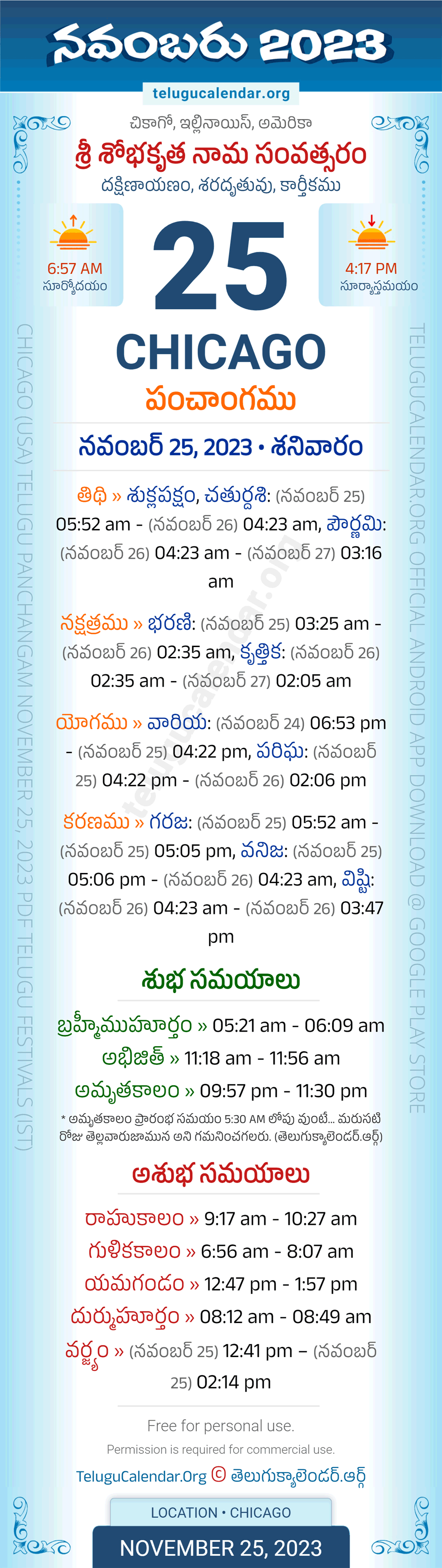 Download » November 25, 2023 » Chicago (USA) Telugu Panchangam Daily Sheet with Auspicious and Inauspicious Timings.