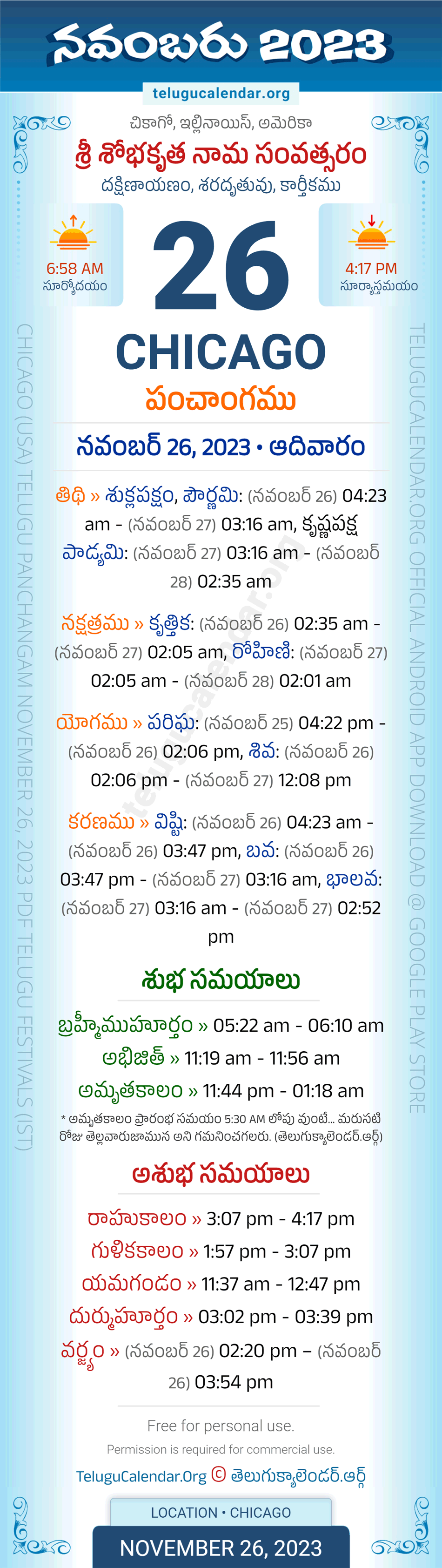 Chicago Panchangam November 26, 2023 Daily Sheet in Telugu... Chicago Telugu Panchangam Sunday, November 26, 2023, Today's Chicago Tithi: Sukla Paksham, Pournami: (Nov 26) 04:23 am - (Nov 27) 03:16 am, Krishna Paksha Padyami: (Nov 27) 03:16 am - (Nov 28) 02:35 am, Today's Chicago Nakshatram: Krithika: (Nov 26) 02:35 am - (Nov 27) 02:05 am, Krithika: (Nov 27) 02:05 am - (Nov 28) 02:01 am, Telugu Year: Sri Sobhakritu Nama Samvatsaram, Vedic Aayana: Dakshinayanam, Vedic Rutuvu: Sharad, Chandramasa (Amanta): Kartikamu. Below image showing information about the 5 attributes of the day, viz., Varam, Tithi, Nakshatram, Yogam & Karanam along with starting and end timings. Read more