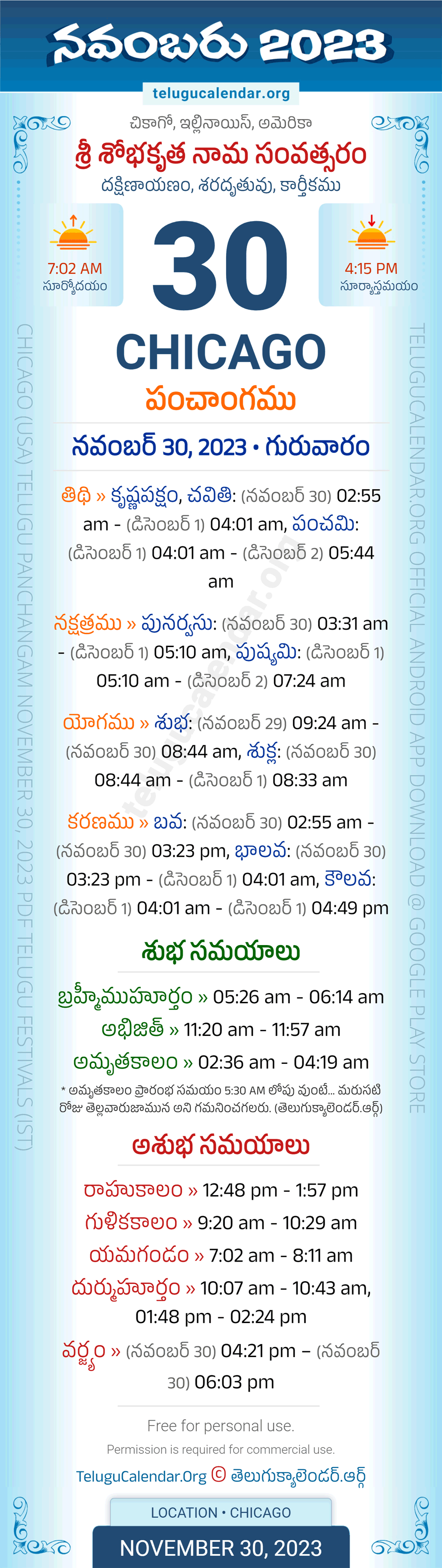 Apart from the Panchangam November 30, 2023 Chicago Telugu Calendar Daily Sheet, you can also find the Sunrise and Sunset (Middle Limb) timings, Paksham, Telugu Year, Yanam, Rutuvu, Telugu Month. Today's Chicago Auspicious Timings November 30, 2023 (Shubha Muhuratam Today Good Timings like Abhijit Muhurtham, Amruta Kalam & Brahma Muhurtham) and Today's Chicago Inauspicious Timings November 30, 2023 (Bad Timings like Durmuhurtham, Rahukalam, Gulika kalam & Yamagandam) with starting and end timings in the above image.