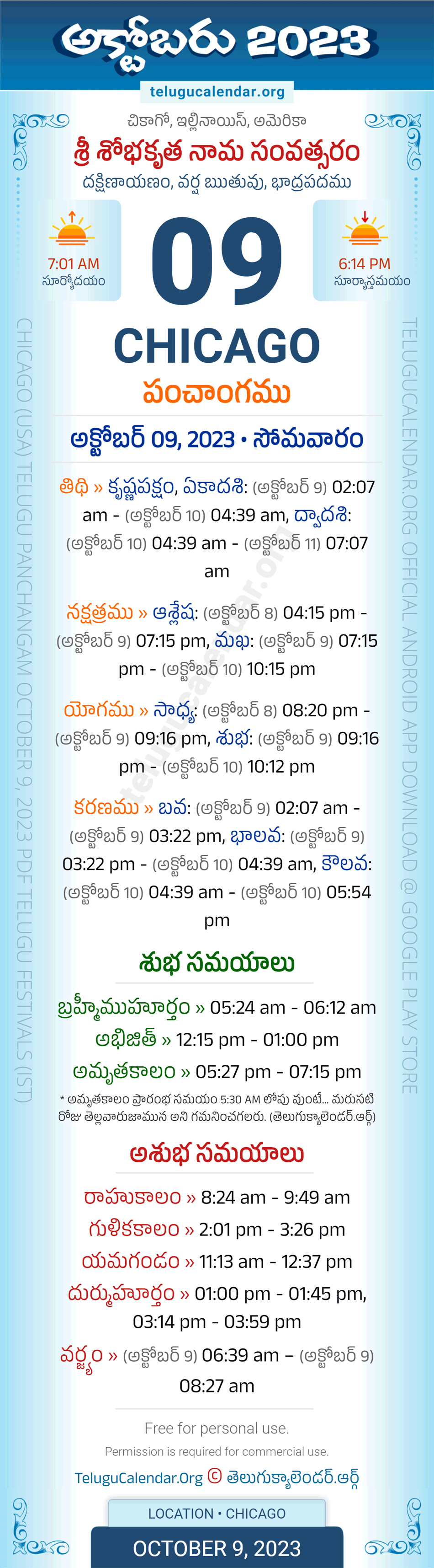 Apart from the Panchangam October 9, 2023 Chicago Telugu Calendar Daily Sheet, you can also find the Sunrise and Sunset (Middle Limb) timings, Paksham, Telugu Year, Yanam, Rutuvu, Telugu Month. Today's Chicago Auspicious Timings October 9, 2023 (Shubha Muhuratam Today Good Timings like Abhijit Muhurtham, Amruta Kalam & Brahma Muhurtham) and Today's Chicago Inauspicious Timings October 9, 2023 (Bad Timings like Durmuhurtham, Rahukalam, Gulika kalam & Yamagandam) with starting and end timings in the above image.