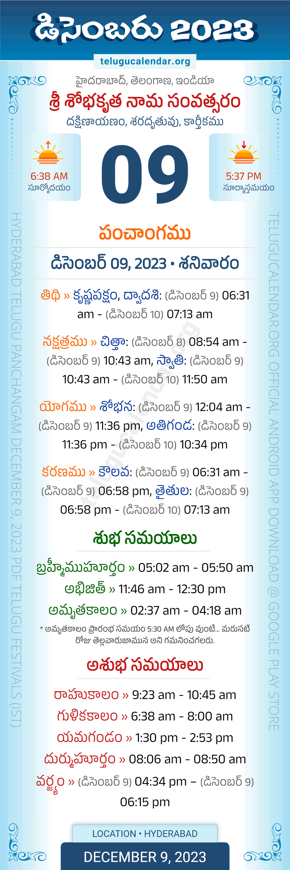 Download » December 9, 2023 » Hyderabad, Telangana Telugu Calendar Panchangam Daily Sheet with Auspicious and Inauspicious Timings.