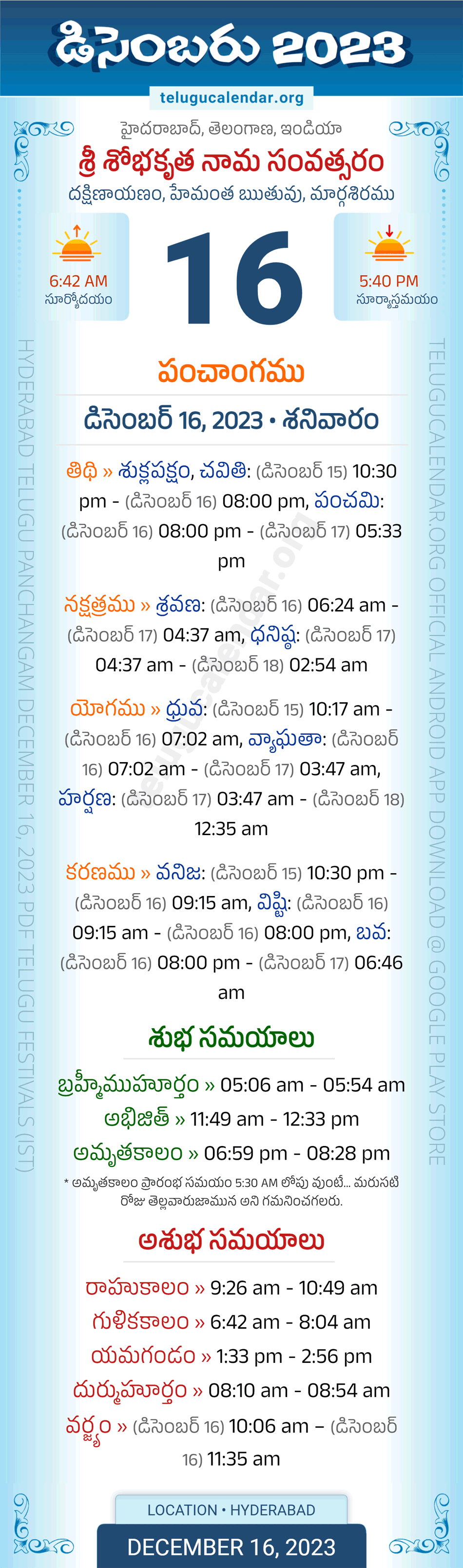 Download » December 16, 2023 » Hyderabad, Telangana Telugu Calendar Panchangam Daily Sheet with Auspicious and Inauspicious Timings.