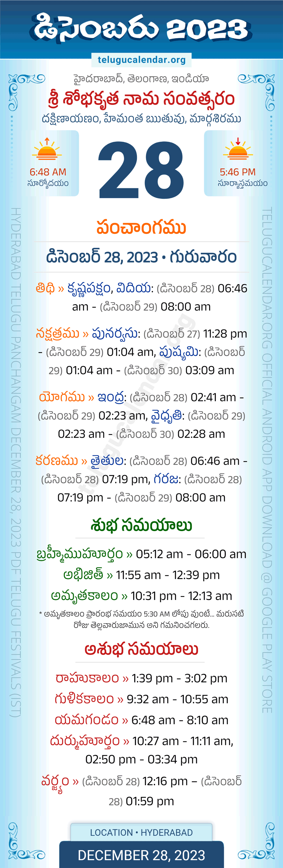 Download » December 28, 2023 » Hyderabad, Telangana Telugu Calendar Panchangam Daily Sheet with Auspicious and Inauspicious Timings.