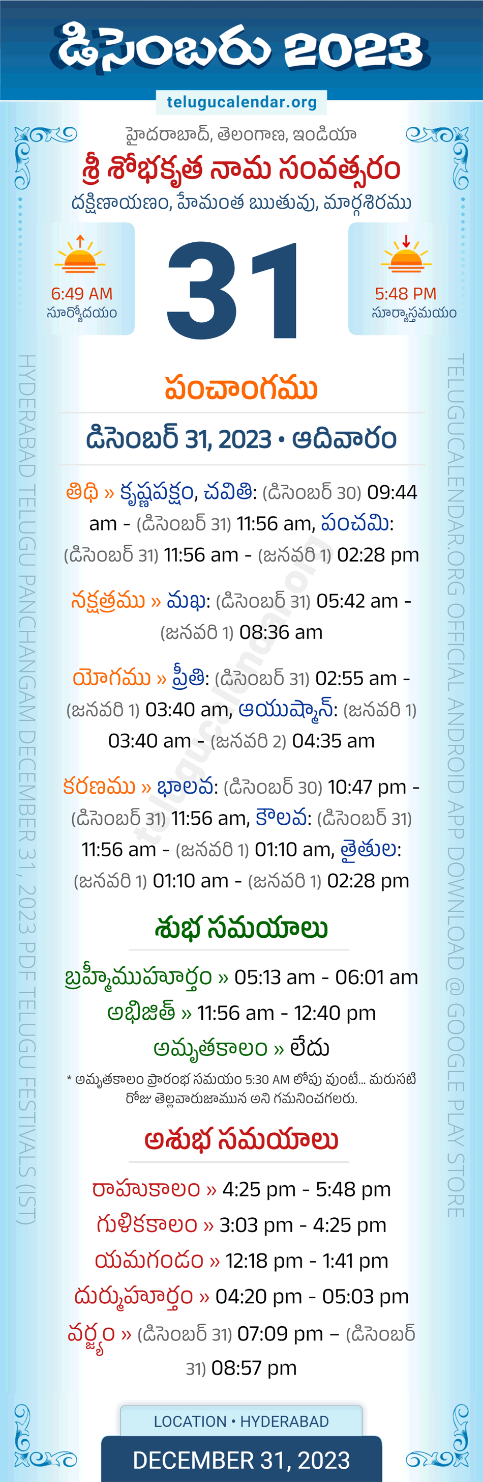 Panchangam December 31, 2023 Telugu Calendar Daily Sheet for Hyderabad (Telangana)... Amavasya Date in December 2023 and Pournami Date in December 2023. Today Telugu Panchangam Date: Sunday, December 31, 2023, Today Tithi: Krishna Paksham, Chavithi: (Dec 30) 09:44 am - (Dec 31) 11:56 am, Panchami: (Dec 31) 11:56 am - (Jan 1) 02:28 pm, Today Nakshatram: Makha: (Dec 31) 05:42 am - (Jan 1) 08:36 am, Telugu Year: Sri Sobhakritu Nama Samvatsaram, Vedic Aayana: Dakshinayanam, Vedic Rutuvu: Hemanta, Chandramasa (Amanta): Margasiramu. Below image showing information about the 5 attributes of the day, viz., Varam, Tithi, Nakshatram, Yogam & Karanam along with starting and end timings. Read more