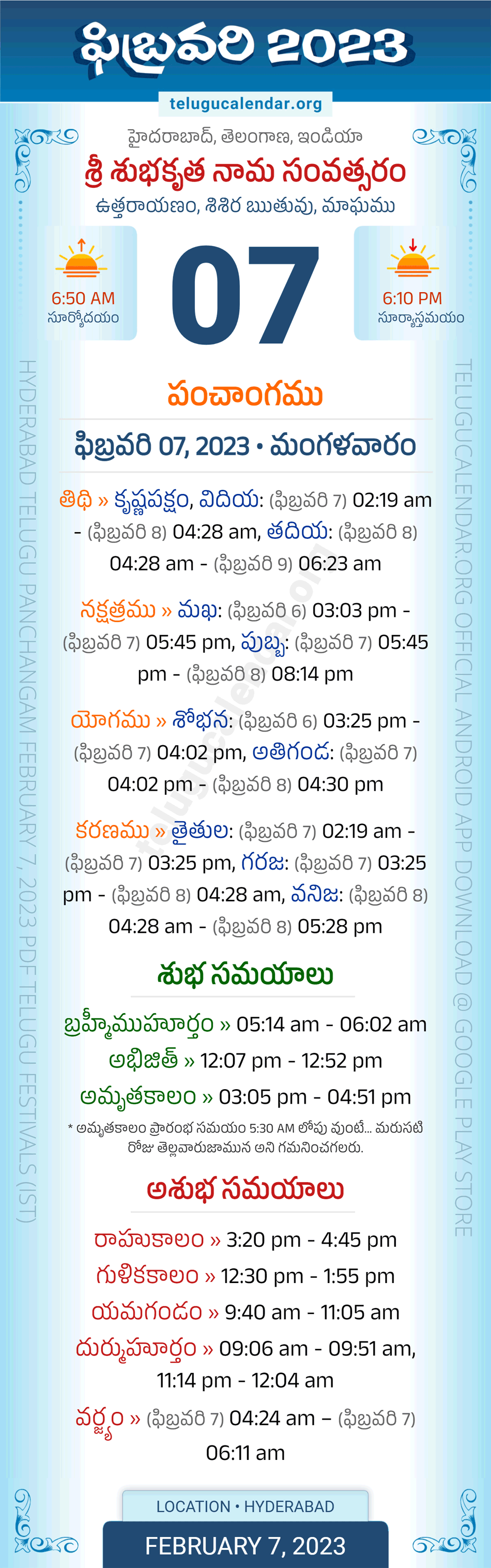 Download » February 7, 2023 » Hyderabad, Telangana Telugu Calendar Panchangam Daily Sheet with Auspicious and Inauspicious Timings.