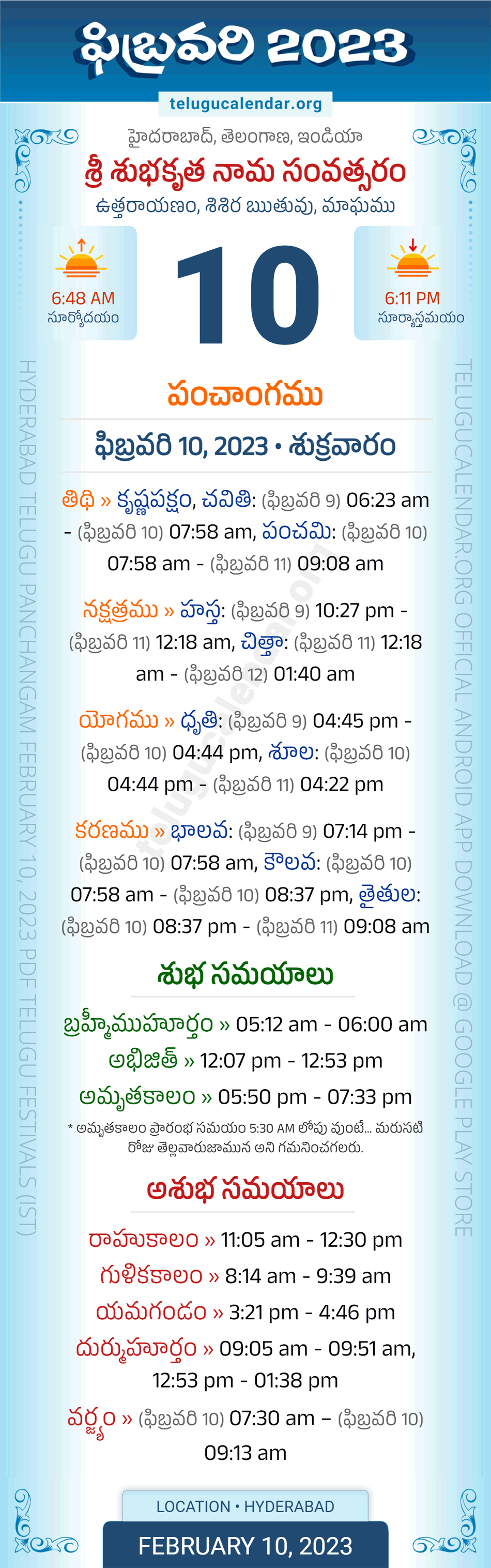 Download » February 10, 2023 » Hyderabad, Telangana Telugu Calendar Panchangam Daily Sheet with Auspicious and Inauspicious Timings.