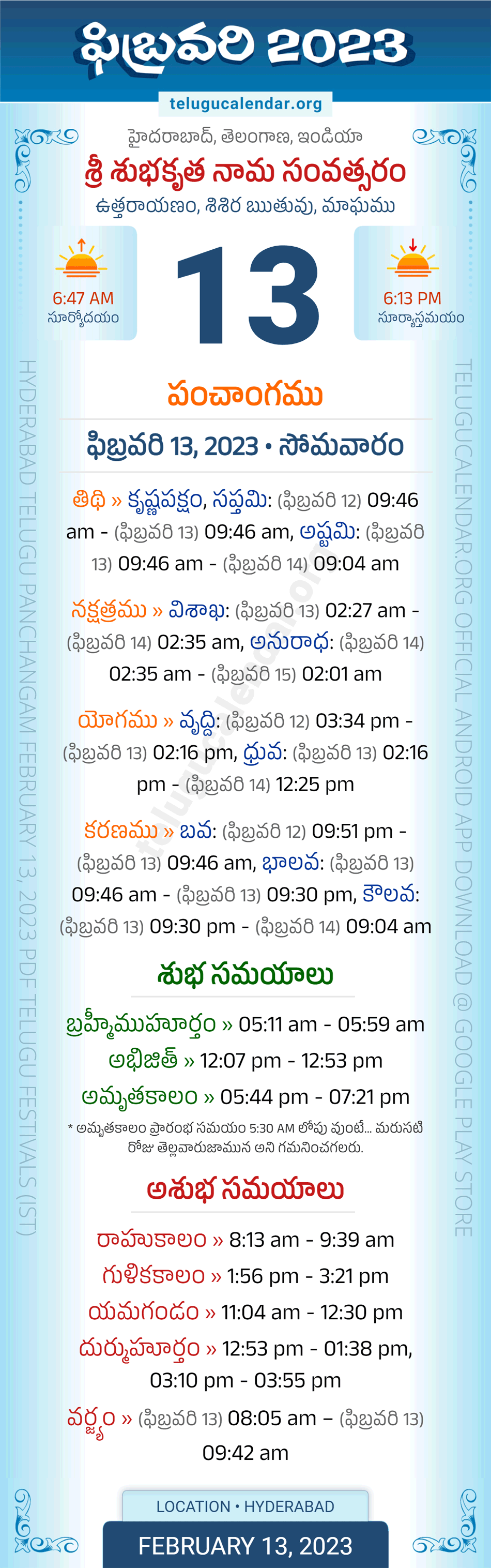 Download » February 13, 2023 » Hyderabad, Telangana Telugu Calendar Panchangam Daily Sheet with Auspicious and Inauspicious Timings.