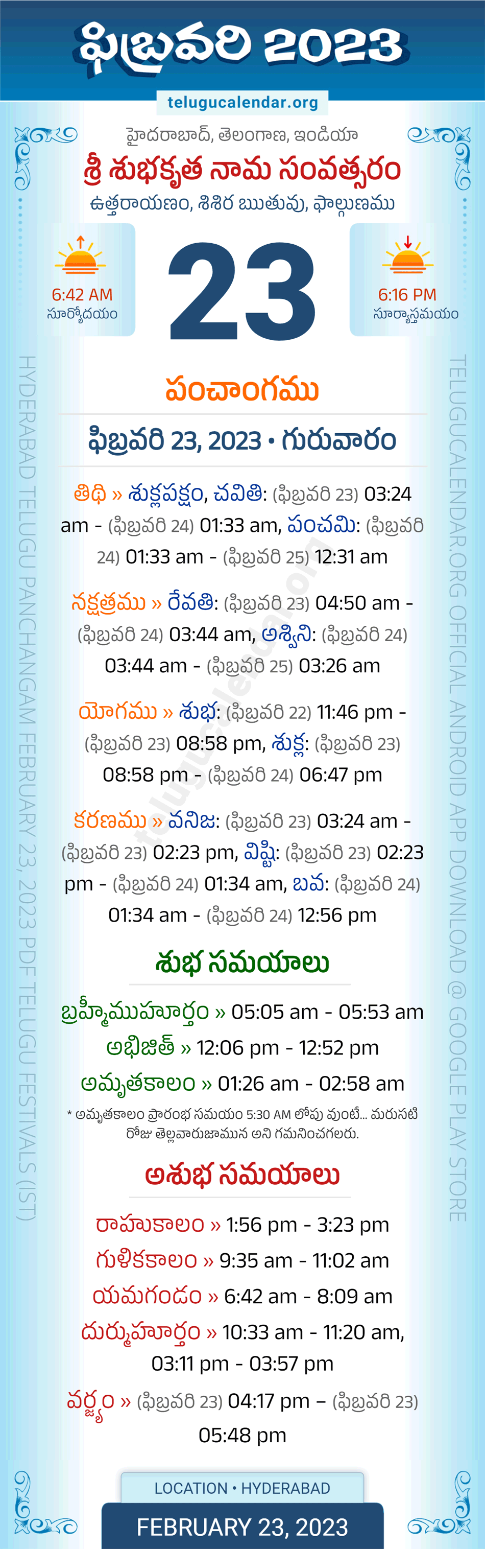 Download » February 23, 2023 » Hyderabad, Telangana Telugu Calendar Panchangam Daily Sheet with Auspicious and Inauspicious Timings.