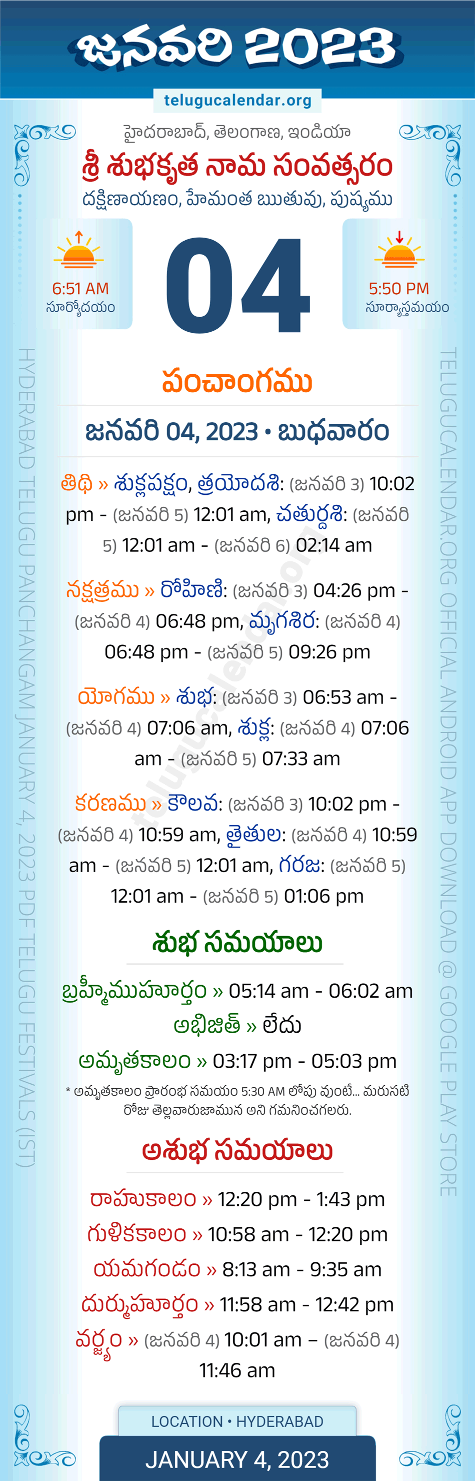 Download » January 4, 2023 » Hyderabad, Telangana Telugu Calendar Panchangam Daily Sheet with Auspicious and Inauspicious Timings.