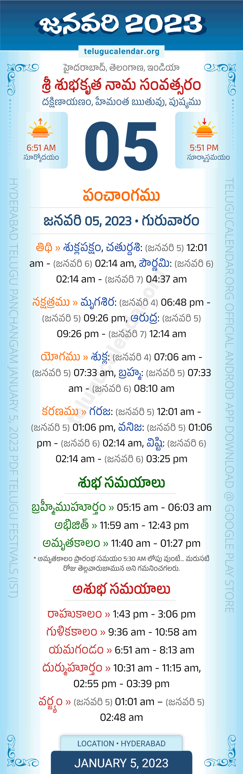 Download » January 5, 2023 » Hyderabad, Telangana Telugu Calendar Panchangam Daily Sheet with Auspicious and Inauspicious Timings.