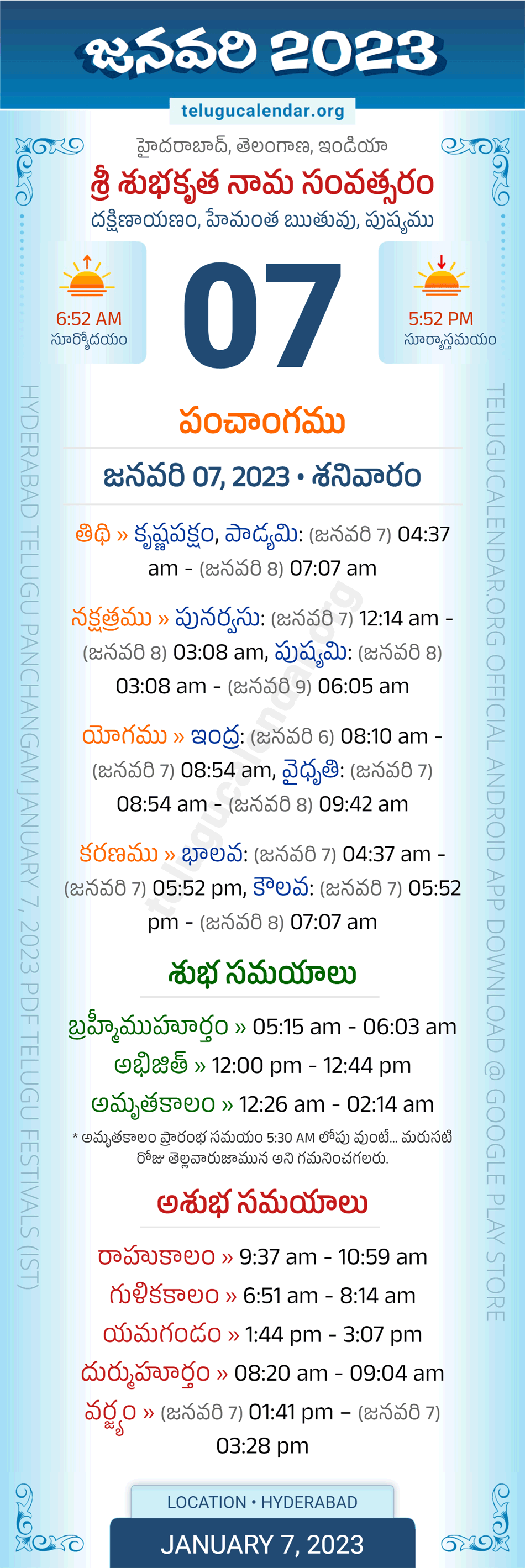 Download » January 7, 2023 » Hyderabad, Telangana Telugu Calendar Panchangam Daily Sheet with Auspicious and Inauspicious Timings.