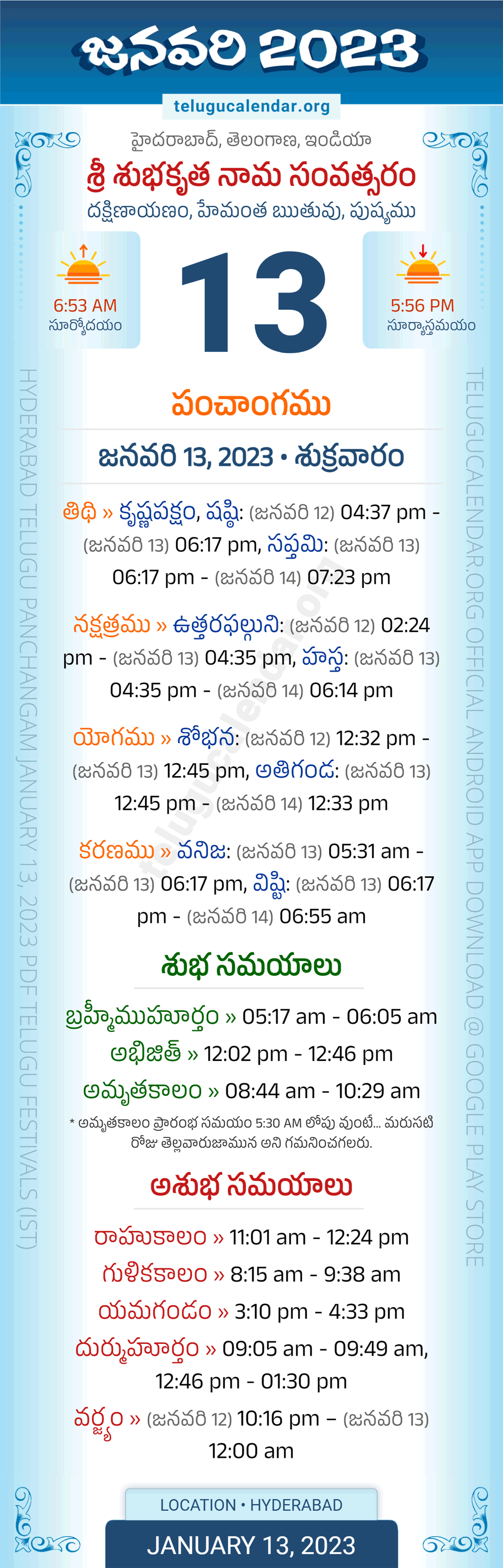 Download » January 13, 2023 » Hyderabad, Telangana Telugu Calendar Panchangam Daily Sheet with Auspicious and Inauspicious Timings.