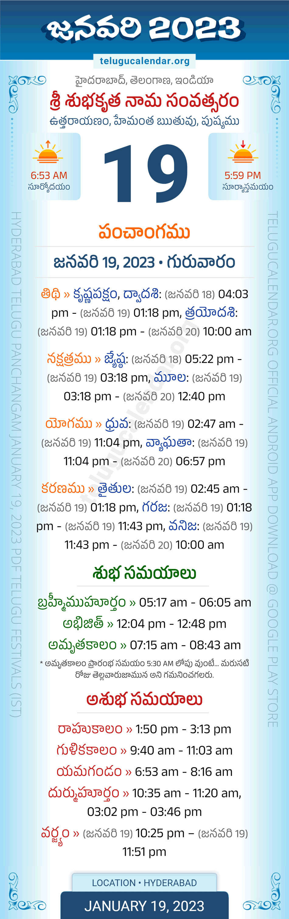 Download » January 19, 2023 » Hyderabad, Telangana Telugu Calendar Panchangam Daily Sheet with Auspicious and Inauspicious Timings.