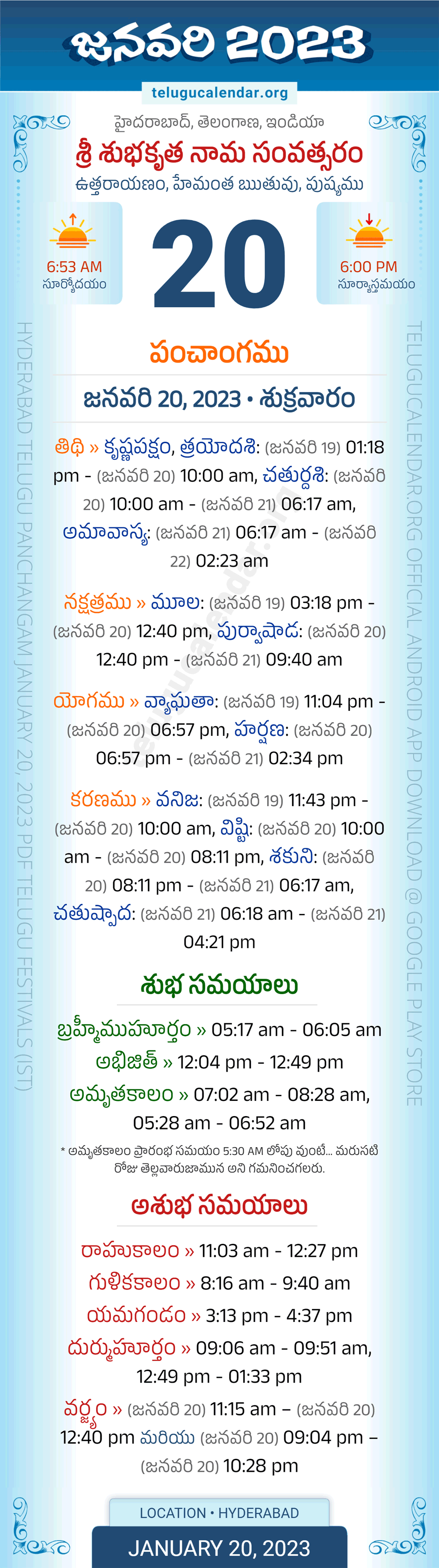 Download » January 20, 2023 » Hyderabad, Telangana Telugu Calendar Panchangam Daily Sheet with Auspicious and Inauspicious Timings.