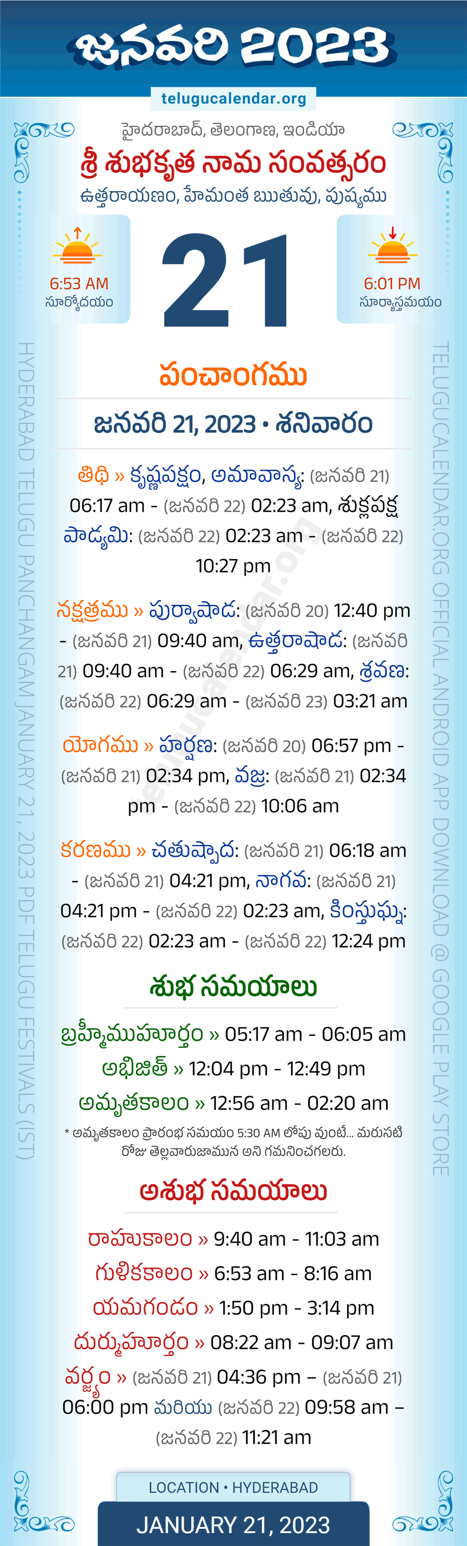 Download » January 21, 2023 » Hyderabad, Telangana Telugu Calendar Panchangam Daily Sheet with Auspicious and Inauspicious Timings.