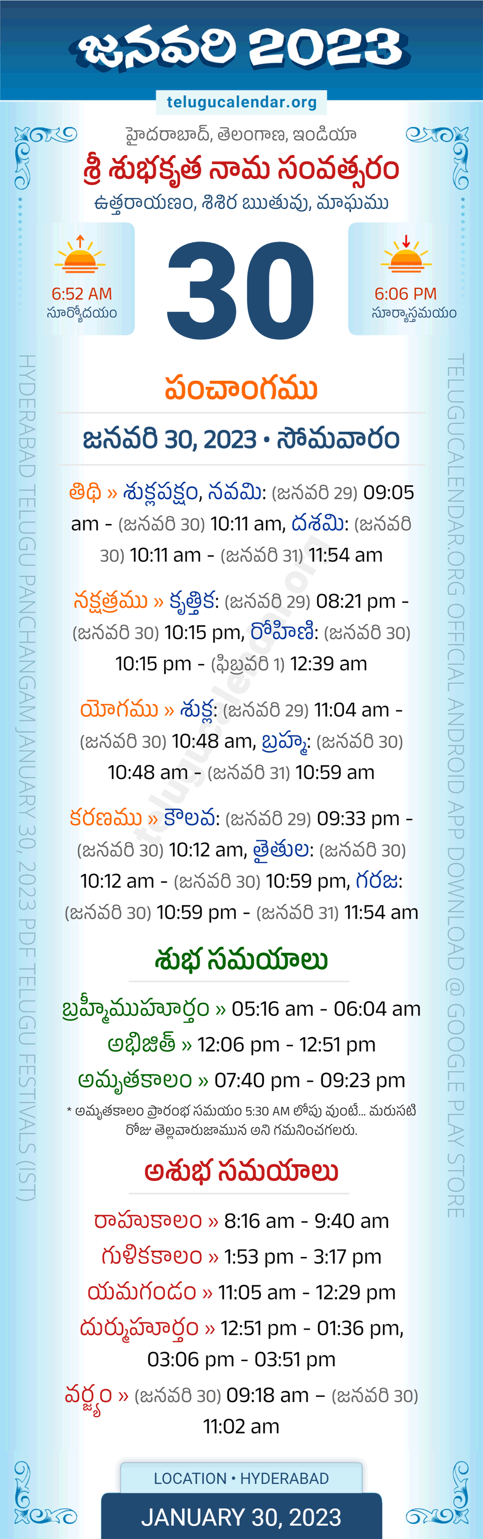 Download » January 30, 2023 » Hyderabad, Telangana Telugu Calendar Panchangam Daily Sheet with Auspicious and Inauspicious Timings.