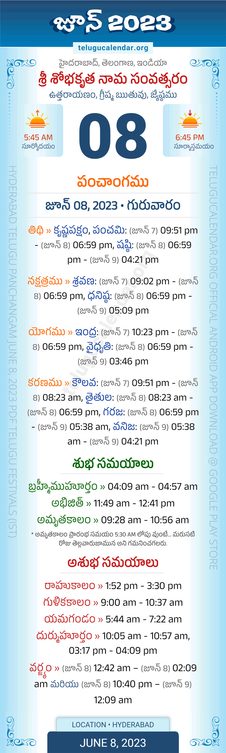 Download » June 8, 2023 » Hyderabad, Telangana Telugu Calendar Panchangam Daily Sheet with Auspicious and Inauspicious Timings.