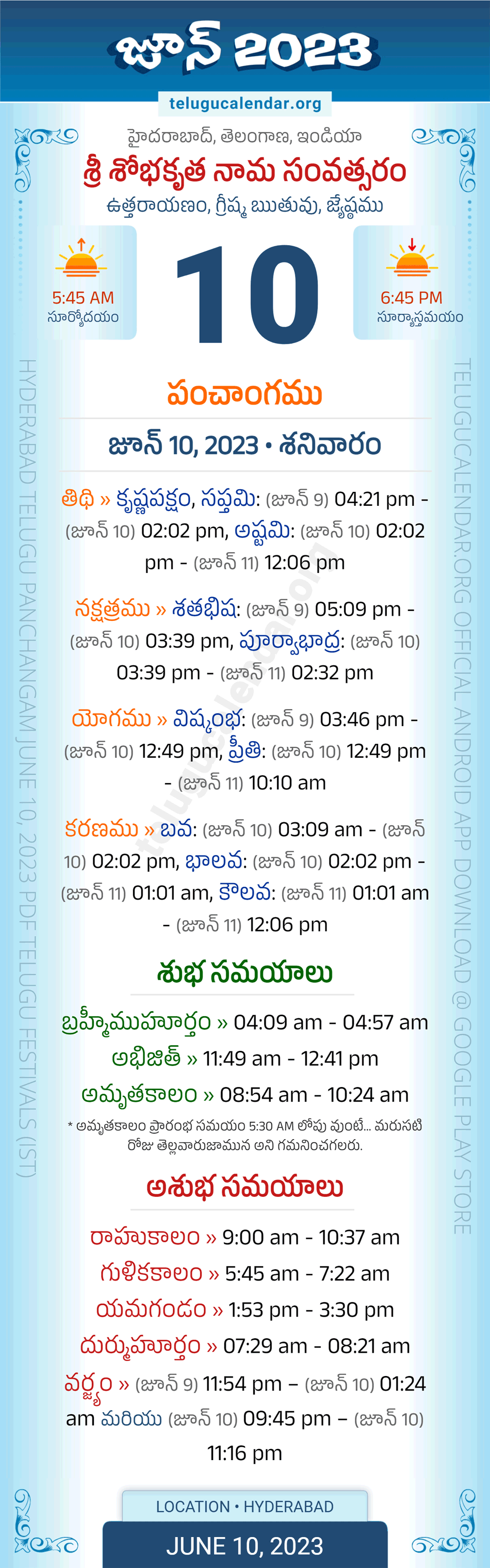Download » June 10, 2023 » Hyderabad, Telangana Telugu Calendar Panchangam Daily Sheet with Auspicious and Inauspicious Timings.