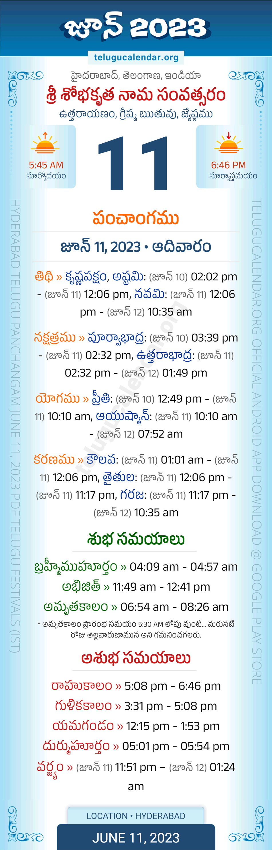 Download » June 11, 2023 » Hyderabad, Telangana Telugu Calendar Panchangam Daily Sheet with Auspicious and Inauspicious Timings.