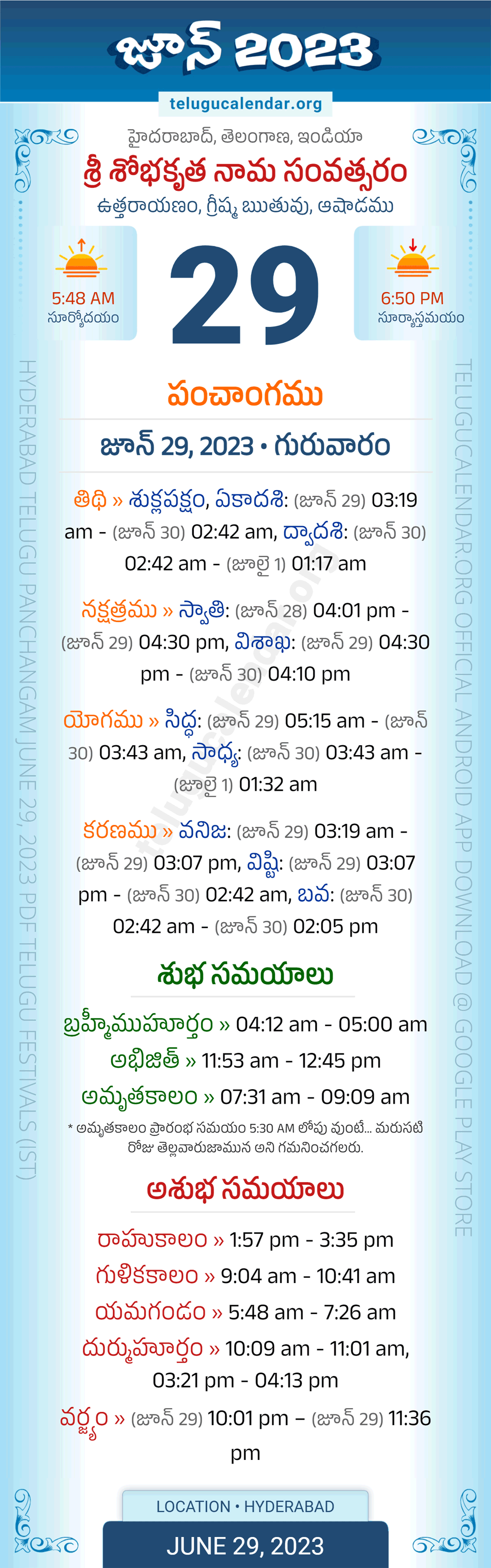 Download » June 29, 2023 » Hyderabad, Telangana Telugu Calendar Panchangam Daily Sheet with Auspicious and Inauspicious Timings.