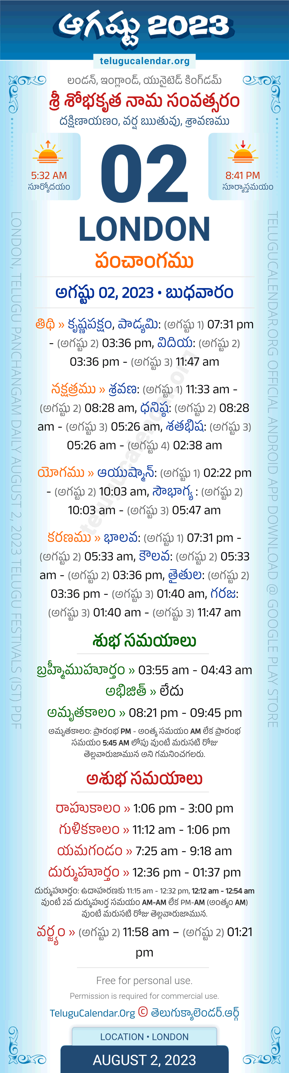 Download » August 2, 2023 » London (UK) Telugu Panchangam Daily Sheet with Auspicious and Inauspicious Timings.