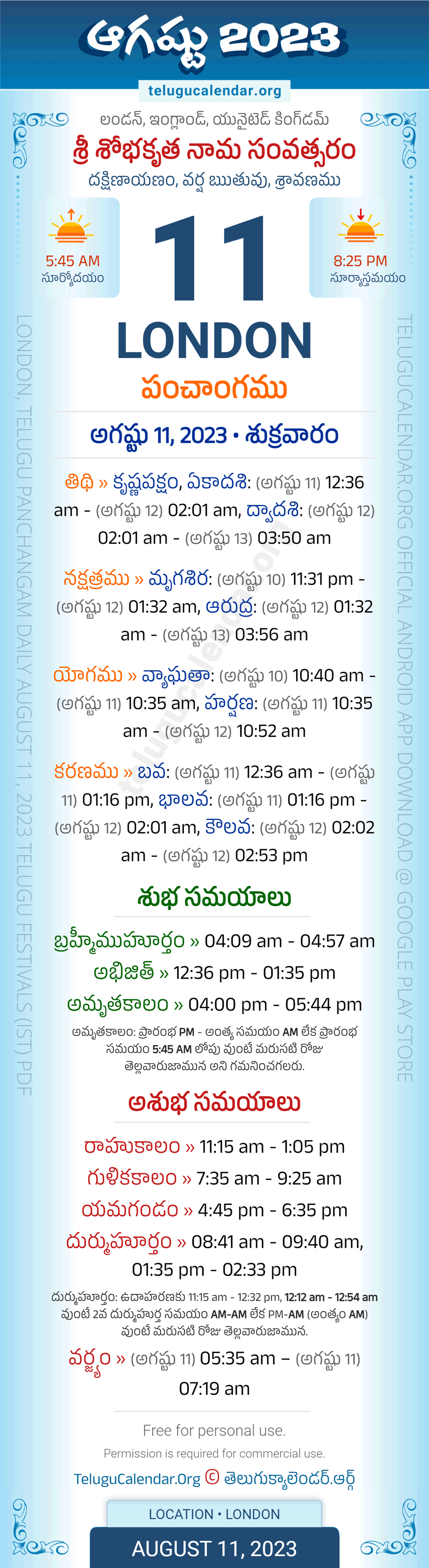 London Panchangam August 11, 2023 Daily Sheet in Telugu... London Telugu Panchangam Friday, August 11, 2023, Today's London Tithi: Krishna Paksham, Ekadashi: (Aug 11) 12:36 am - (Aug 12) 02:01 am, Dwadasi: (Aug 12) 02:01 am - (Aug 13) 03:50 am, Today's London Nakshatram: Mrigasira: (Aug 10) 11:31 pm - (Aug 12) 01:32 am, Arudra: (Aug 12) 01:32 am - (Aug 13) 03:56 am, Telugu Year: Sri Sobhakritu Nama Samvatsaram, Vedic Aayana: Dakshinayanam, Vedic Rutuvu: Varsha, Chandramasa (Amanta): Sravanamu. Below image showing information about the 5 attributes of the day, viz., Varam, Tithi, Nakshatram, Yogam & Karanam along with starting and end timings. Read more