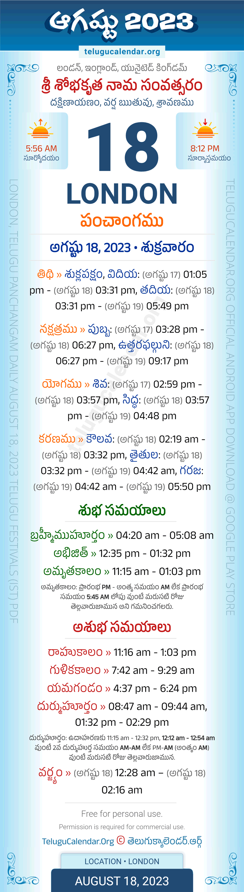 London Panchangam August 18, 2023 Daily Sheet in Telugu... London Telugu Panchangam Friday, August 18, 2023, Today's London Tithi: Sukla Paksham, Vidiya: (Aug 17) 01:05 pm - (Aug 18) 03:31 pm, Thadiya: (Aug 18) 03:31 pm - (Aug 19) 05:49 pm, Today's London Nakshatram: Purva Phalguni: (Aug 17) 03:28 pm - (Aug 18) 06:27 pm, Uttara Phalguni: (Aug 18) 06:27 pm - (Aug 19) 09:17 pm, Telugu Year: Sri Sobhakritu Nama Samvatsaram, Vedic Aayana: Dakshinayanam, Vedic Rutuvu: Varsha, Chandramasa (Amanta): Sravanamu. Below image showing information about the 5 attributes of the day, viz., Varam, Tithi, Nakshatram, Yogam & Karanam along with starting and end timings. Read more