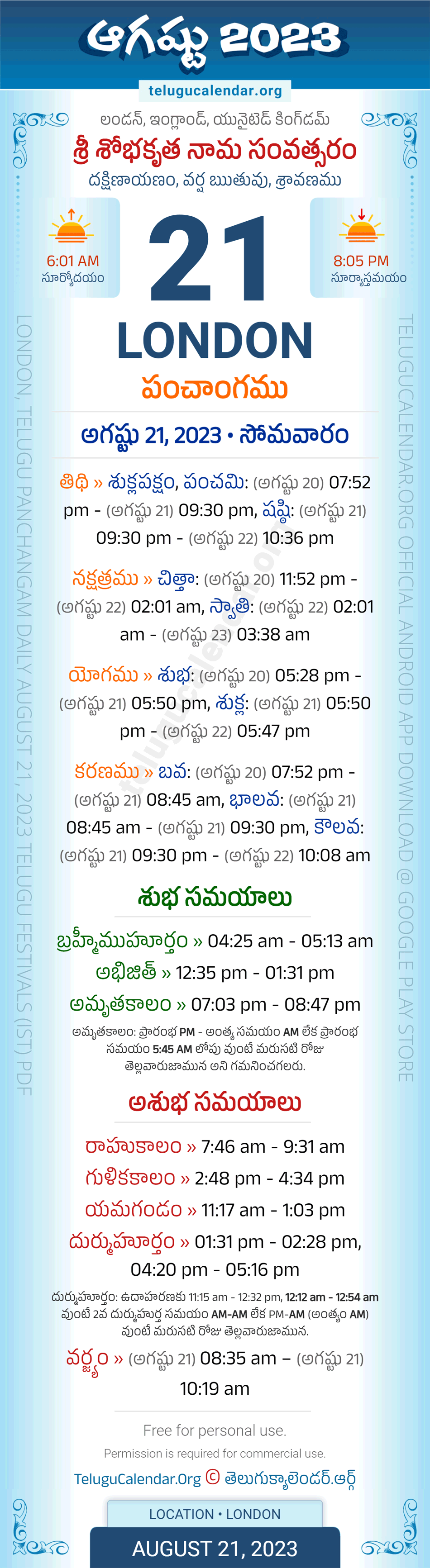 London Panchangam August 21, 2023 Daily Sheet in Telugu... London Telugu Panchangam Monday, August 21, 2023, Today's London Tithi: Sukla Paksham, Panchami: (Aug 20) 07:52 pm - (Aug 21) 09:30 pm, Shashthi: (Aug 21) 09:30 pm - (Aug 22) 10:36 pm, Today's London Nakshatram: Chiththa: (Aug 20) 11:52 pm - (Aug 22) 02:01 am, Swathi: (Aug 22) 02:01 am - (Aug 23) 03:38 am, Telugu Year: Sri Sobhakritu Nama Samvatsaram, Vedic Aayana: Dakshinayanam, Vedic Rutuvu: Varsha, Chandramasa (Amanta): Sravanamu. Below image showing information about the 5 attributes of the day, viz., Varam, Tithi, Nakshatram, Yogam & Karanam along with starting and end timings. Read more