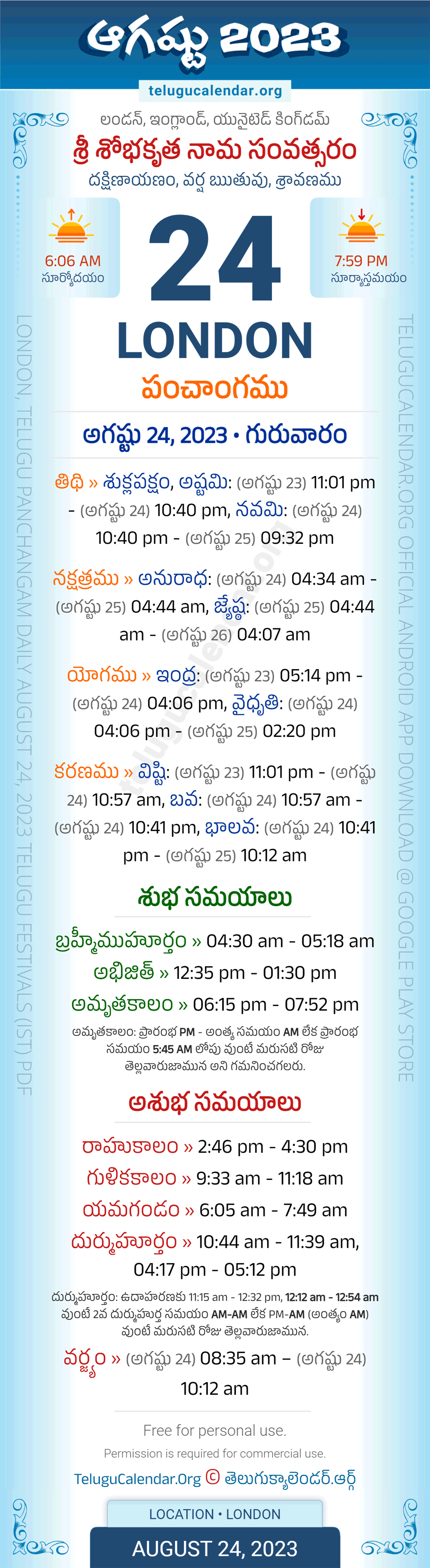 London Panchangam August 24, 2023 Daily Sheet in Telugu... London Telugu Panchangam Thursday, August 24, 2023, Today's London Tithi: Sukla Paksham, Ashtami: (Aug 23) 11:01 pm - (Aug 24) 10:40 pm, Navami: (Aug 24) 10:40 pm - (Aug 25) 09:32 pm, Today's London Nakshatram: Anuradha: (Aug 24) 04:34 am - (Aug 25) 04:44 am, Jyestha: (Aug 25) 04:44 am - (Aug 26) 04:07 am, Telugu Year: Sri Sobhakritu Nama Samvatsaram, Vedic Aayana: Dakshinayanam, Vedic Rutuvu: Varsha, Chandramasa (Amanta): Sravanamu. Below image showing information about the 5 attributes of the day, viz., Varam, Tithi, Nakshatram, Yogam & Karanam along with starting and end timings. Read more