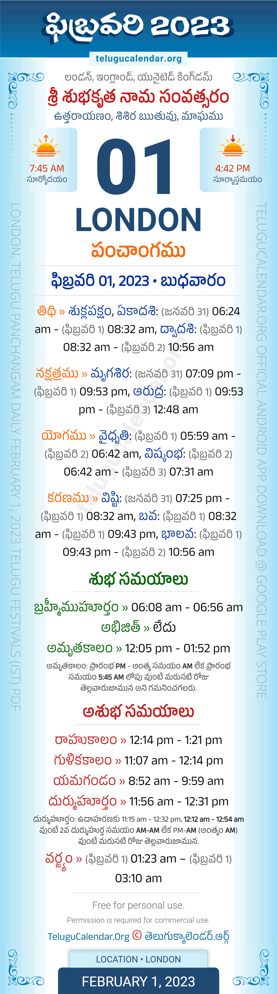Download » February 1, 2023 » London (UK) Telugu Panchangam Daily Sheet with Auspicious and Inauspicious Timings.