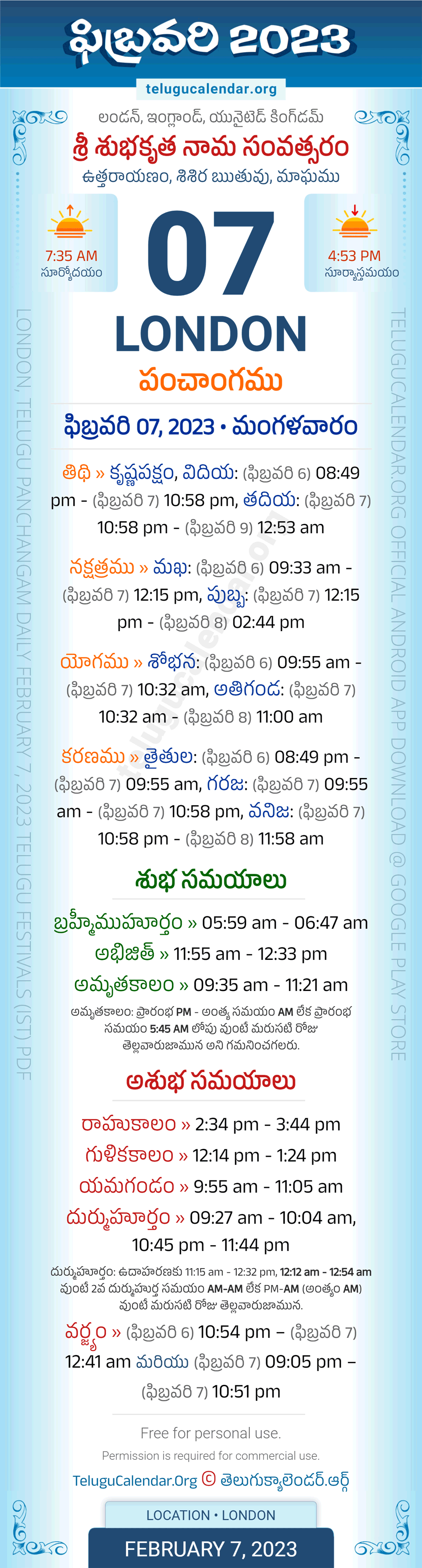 Download » February 7, 2023 » London (UK) Telugu Panchangam Daily Sheet with Auspicious and Inauspicious Timings.