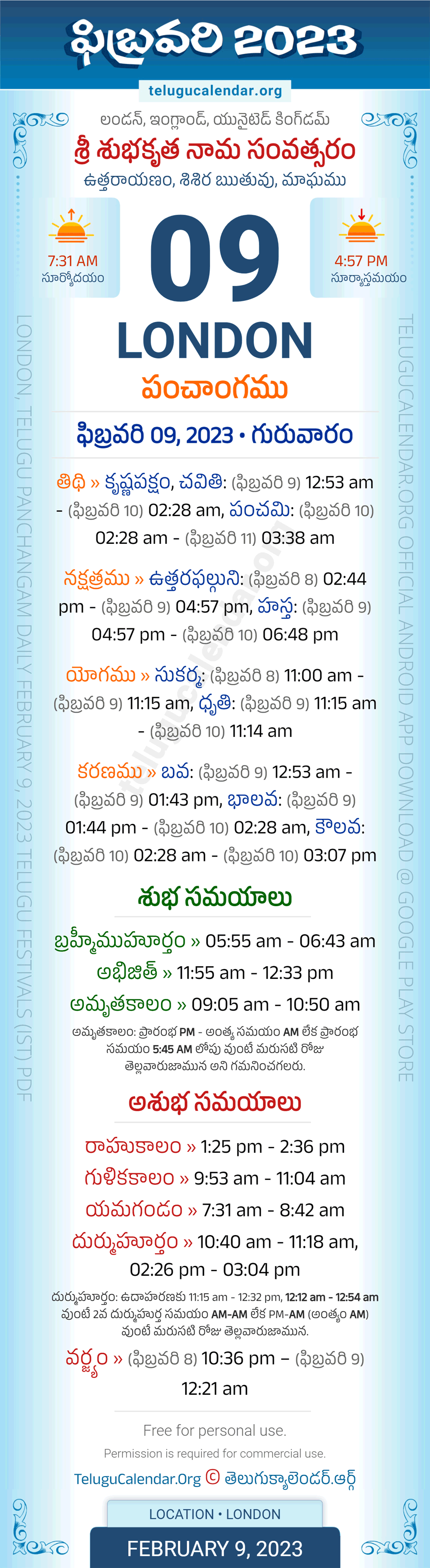Download » February 9, 2023 » London (UK) Telugu Panchangam Daily Sheet with Auspicious and Inauspicious Timings.