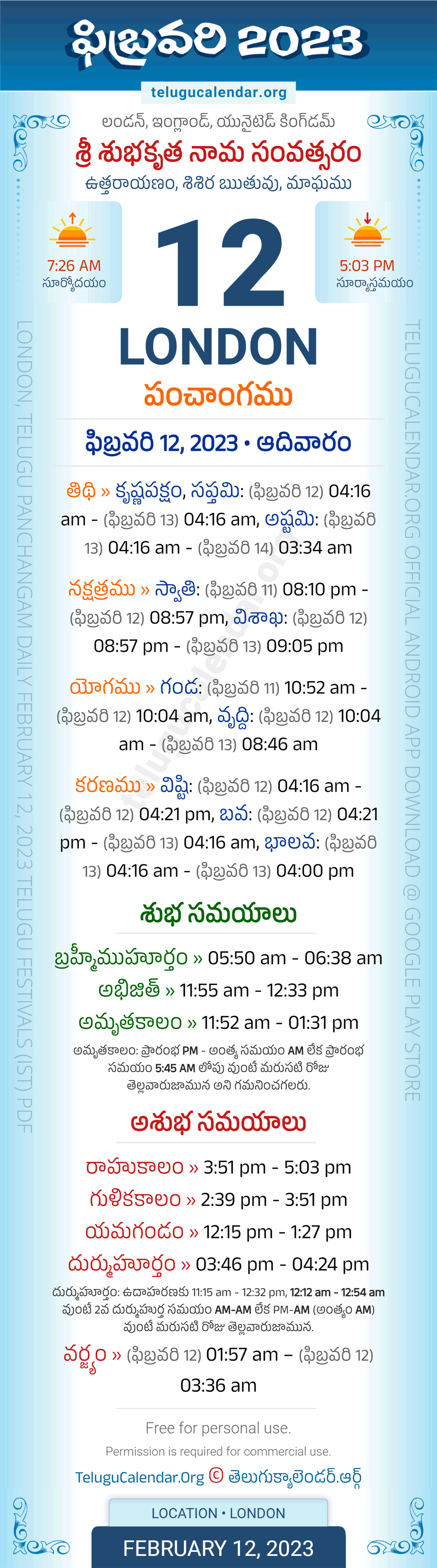 Download » February 12, 2023 » London (UK) Telugu Panchangam Daily Sheet with Auspicious and Inauspicious Timings.