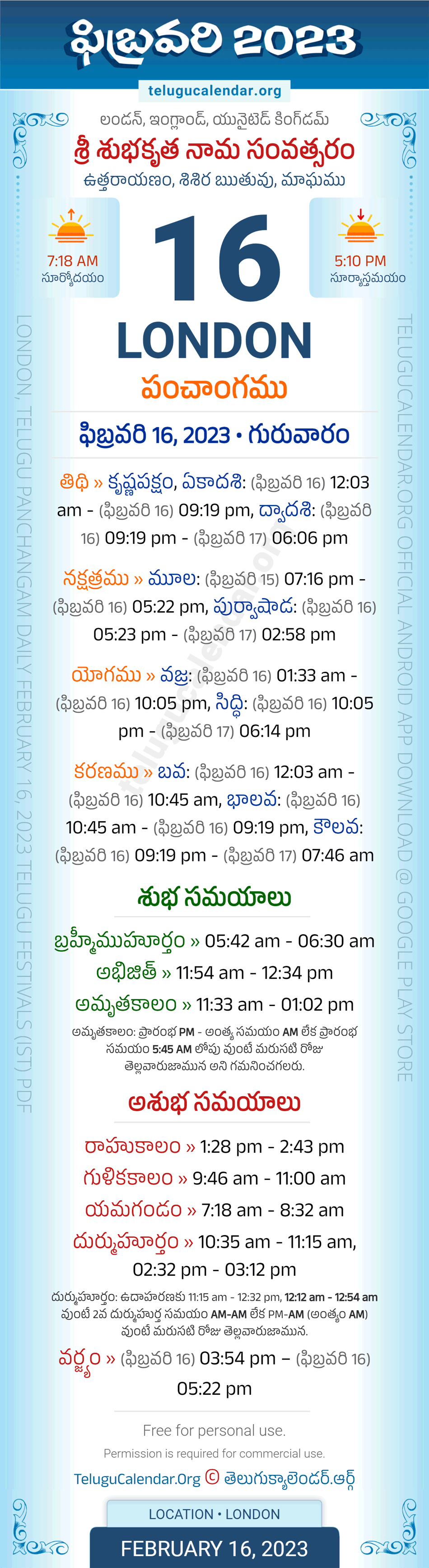 Download » February 16, 2023 » London (UK) Telugu Panchangam Daily Sheet with Auspicious and Inauspicious Timings.