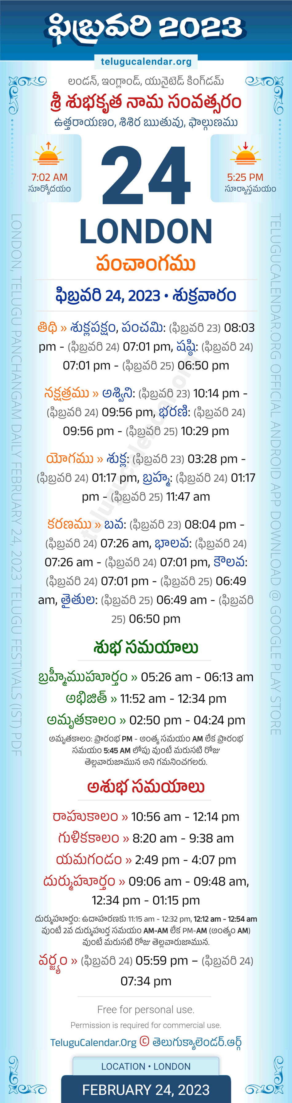 Download » February 24, 2023 » London (UK) Telugu Panchangam Daily Sheet with Auspicious and Inauspicious Timings.